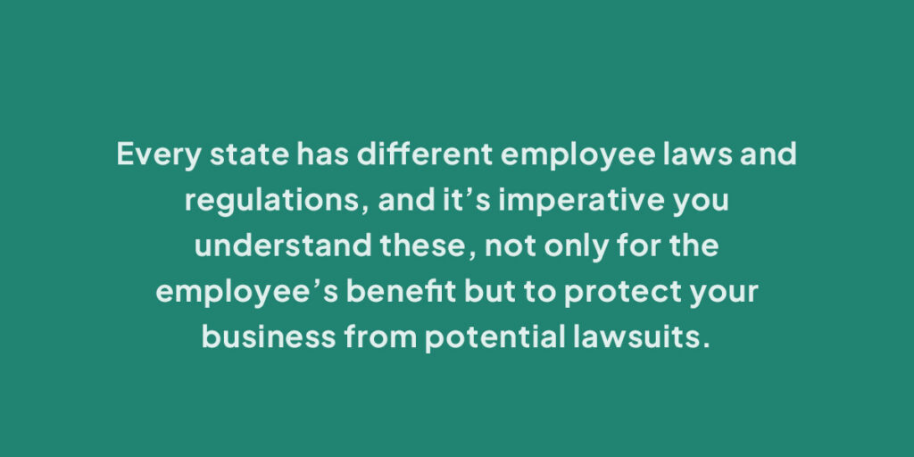 Every state has different employee laws and regulations, and it’s imperative you understand these, not only for the employee’s benefit but to protect your business from potential lawsuits.