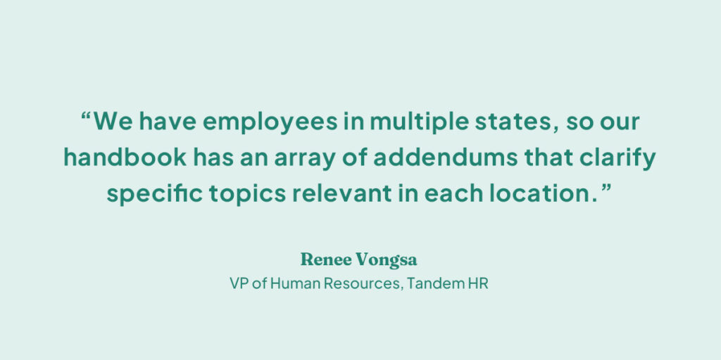 “We have employees in multiple states, so our handbook has an array of addendums that clarify specific topics relevant in each location,” said Renee Vongsa, Vice President of Human Resources at Tandem HR. “We want it to be easy for every employee to understand what matters to them without having to hunt for it.”