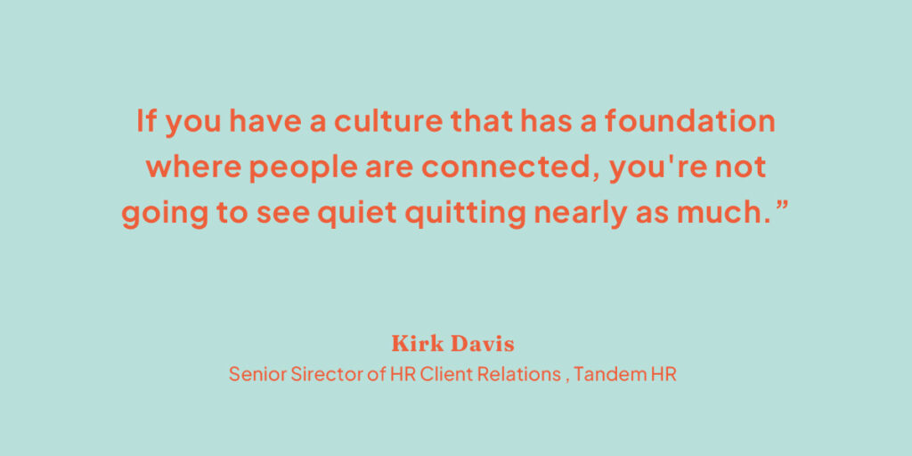Kirk Davis, Tandem HR’s senior director of HR client relations, said a consistent theme he continues to see among businesses dodging the “quiet quitting” freight train, is that they’re intentional with how they keep employees involved and interested in their work.
