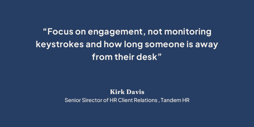 “Focus on engagement, not monitoring keystrokes and how long someone is away from their desk,” Davis said. “If you can spend 20 minutes doing that, you can spend 20 minutes talking with a team member. And you’ll learn pretty quickly that the latter is far more effective when it comes to keeping employees from heading down a path toward quiet quitting.”