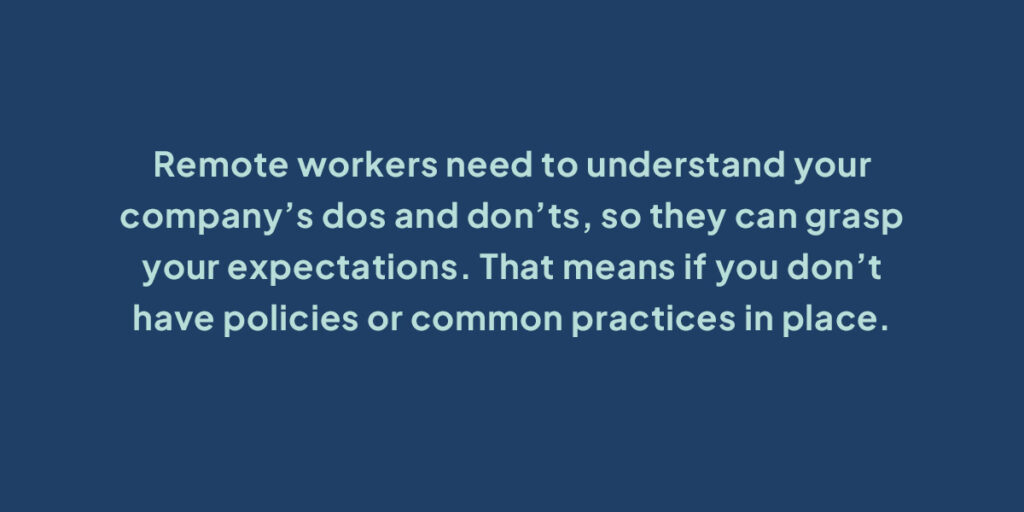 Remote workers need to understand your company’s dos and don’ts, so they can grasp your expectations. That means if you don’t have policies or common practices in place for key aspects of remote work then you need to create them.