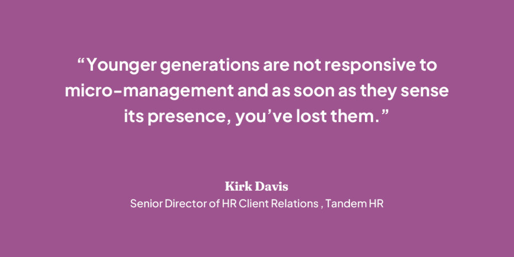 “Younger generations are not responsive to micro-management and as soon as they sense its presence, you’ve lost them,” Davis said. “By that point, they’re looking for another job and putting feelers out.”